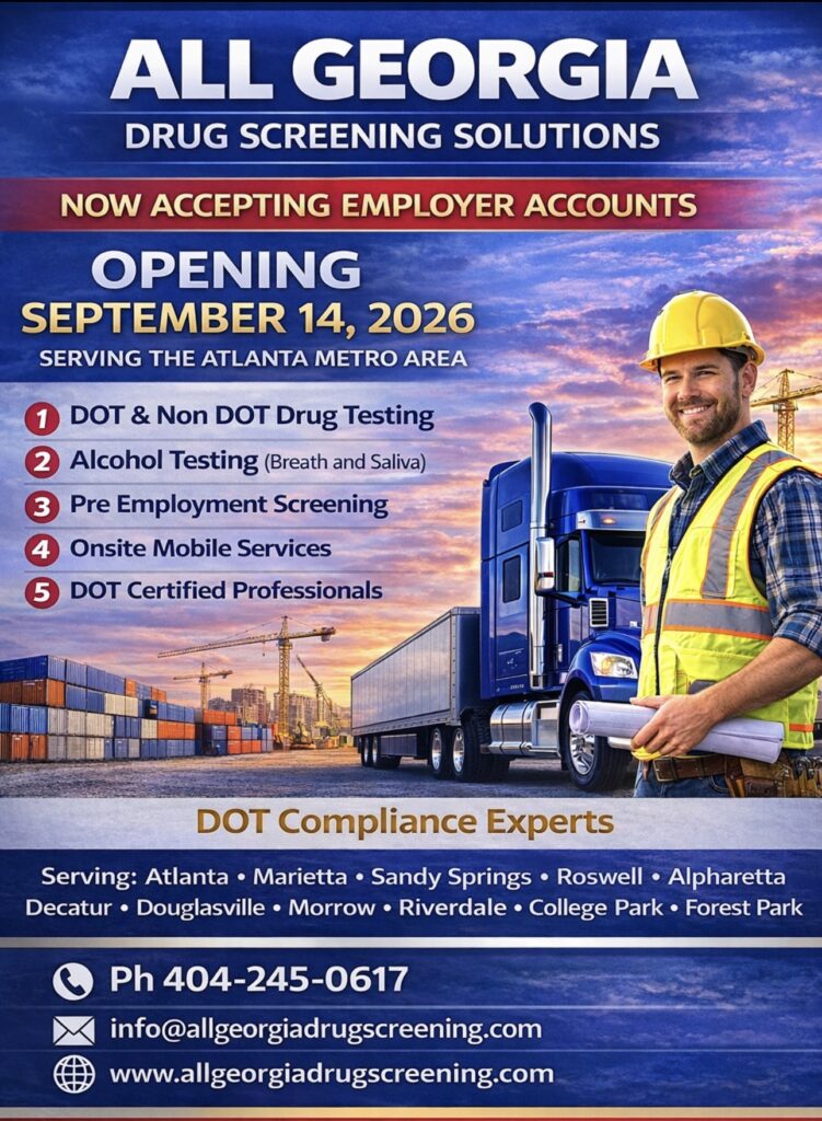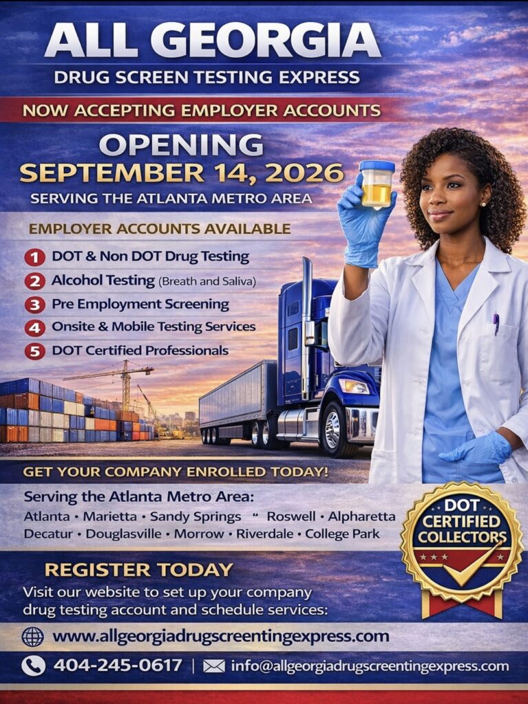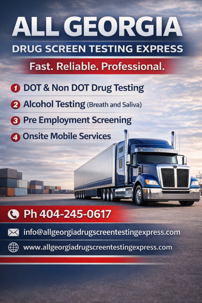 All Georgia Drug Screening Express LLC provides fast, confidential and DOT – NON DOT Compliant mobile drug testing services across Georgia. We partner with employers, owner-Operators, and individuals to deliver reliable, accurate testing that meets federal and state regulations, Our Mission is to make drug testing simple, professional, and convenient by brining certified services directly to your location.